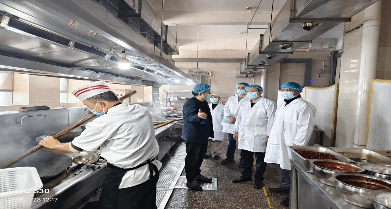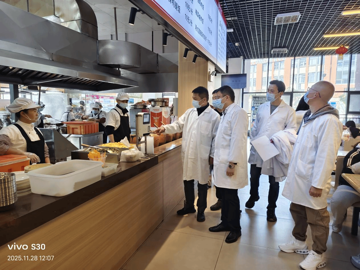 11月28日,副校长冯海涛带队深入学生食堂,开展食品安全专项检查与指导,后勤服务集团总经理罗洪刚及饮食服务中心相关负责人陪同。