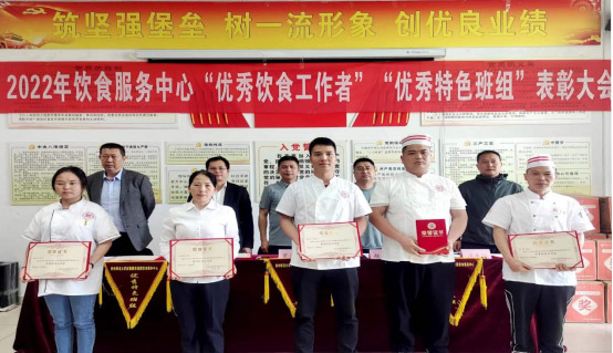 为深入贯彻落实习近平新时代中国特色社会主义思想主题教育精神“学思想、强党性、重实践、建新功”的总要求,提高全体职工的工作积极性与主动性,有效激励职工并树立中心模范标杆,表达中心对员工的关怀与问候,助推学校高质量发展。4月27日,饮食服务中心举办了2022年度“优秀饮食工作者”和“优秀特色班组”表彰大会。后勤服务集团总经理罗洪刚、党总支副书记赵颐、副书记张仁银、副总经理汪永江、副总经理周海出席了会议,饮食服务中心员工代表参会,会议由饮食服务中心经理王杰主持。